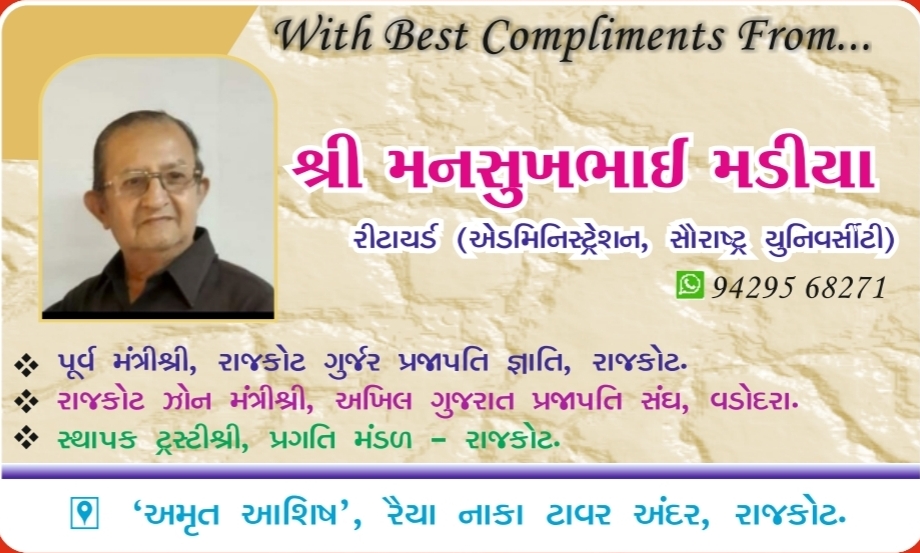 શ્રી રાજકોટ ગુર્જર પ્રજાપતિ જ્ઞાતિ રાજકોટના કારોબારી સભ્યશ્રીઓ :- પ્રમુખ શ્રી મનસુખભાઈ તલસાણીયા, ઉપપ્રમુખ શ્રી અનિલભાઈ ચૌહાણ, મંત્રીશ્રી સુરેશભાઈ ચૌહાણ, સહમંત્રી શ્રી અરવિંદભાઈ પરમાર, ખજાનચી શ્રી કાંતિલાલ પરમાર, સહ ખજાનચી શ્રી દલસુખભાઈ મુંડિયા, શિક્ષણ સમિતિના ચેરમેન શ્રી નિલેશભાઈ પાટડીયા સહ શિક્ષણ મંત્રીશ્રી ભાવેશભાઈ ઝિંઝુવાડીયા બાંધકામ સમિતિના ચેરમેન શ્રી નિલેશભાઈ પરમાર સહ ચેરમેન શ્રી સતિષભાઈ સતાપરા, સંગઠન મંત્રી શ્રી બળવંતભાઈ હળવદિયા સહમંત્રી શ્રી નારાયણભાઈ પ્રજાપતિ, ઓડિટર શ્રી પરેશભાઈ ખોખર, સભ્યશ્રી મહેન્દ્રભાઈ મચ્છોયા, શ્રી મનસુખભાઈ લખતરિયા, શ્રી મનસુખભાઈ સતાપરા, શ્રી અપૂર્વભાઈ હળવદિયા. શ્રી વિનોદભાઈ ગોરવાડીયા. 🌸